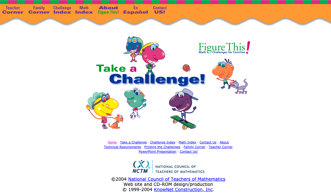 You may view web versions of the challenges from the Challenge Index. To download and print PDF versions of the challenges in color or black and white, see the Download page of the Web site.� For more information, go to the Technical Requirements section.� If you are interested in promoting Figure This! in your community or with your business, we encourage you to do so.