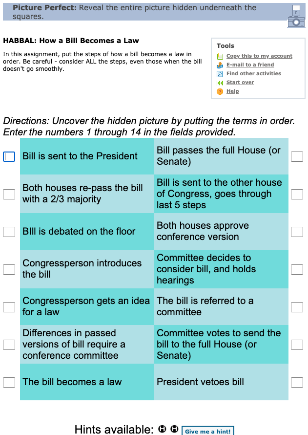 In this activity, students use an interactive quiz to correctly put the steps of how a bill becomes a law in order. They must be careful to consider ALL the steps, even those that take place when the bill doesn't go smoothly.