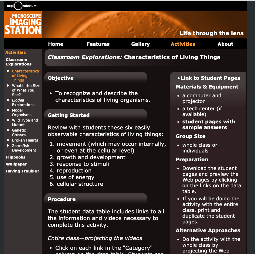 - The instructions for the activity will be found after you make your choice. For this activity we are choosing "Characteristics of Living Things." There are student handouts with links to see videos of microscope observations. The student data table on the handout includes links to all the information and videos necessary to complete this activity.