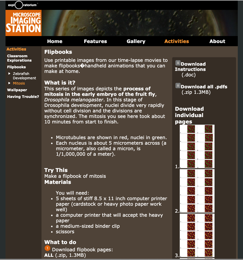 In this activity, students use printable images from a time-lapse movie to make flipbooks—handheld animations. This series of images depicts the process of mitosis in the early embryo of the fruit fly, Drosophila melanogaster. In this stage of Drosophila development, the nuclei divide very rapidly without cell division, and the divisions are synchronized. The mitosis shown took about 10 minutes from start to finish.