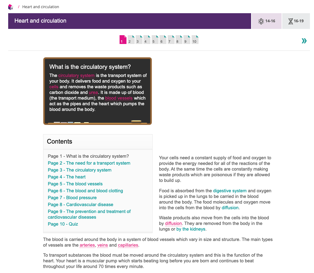 This is an interactive resource on the heart and circulation that can be used to enhance classroom instruction or used as a student tutorial. There are 10 interactive pages, which include the following topics: