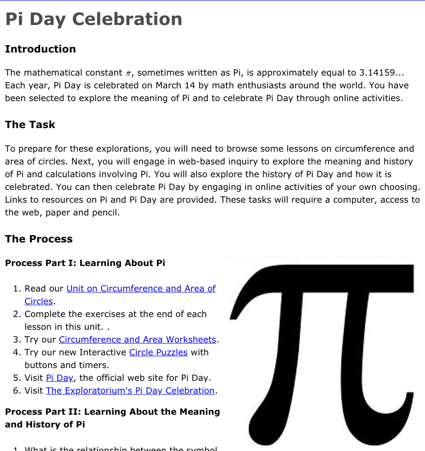 Students also explore the history of Pi Day and how it is celebrated. There are several activities to celebrate Pi Day by engaging students in online activities of their own choosing. Links to resources on Pi and Pi Day are provided.